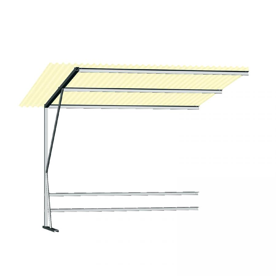 Toiture en polyester ondulé, fixation par crochets, rondelles étanches et écrous.