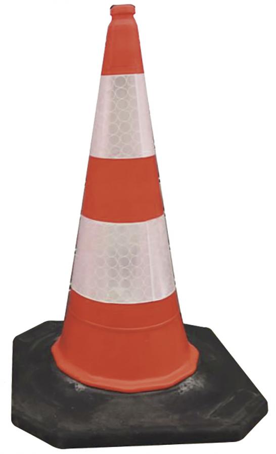 Cône de chantier fluo orange, composé d'une base en caoutchouc recyclé et d'un cône en polyéthylène habillé de 2 colliers de film rétro réfléchissant Starlux classe II.