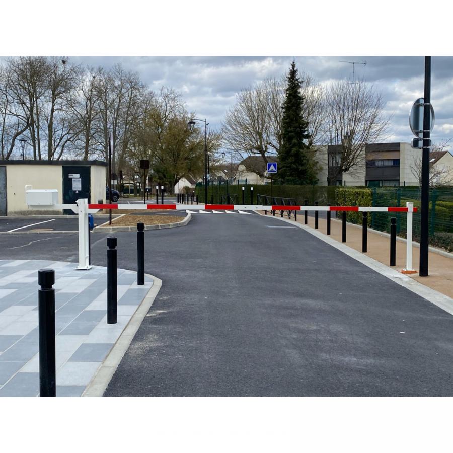 Largeur modulable de 3200 à 6500 mm (distance entre l'axe de rotation et l'extrémité de la barrière) pour une largeur entre poteaux de 3050 à 6400 mm. Rotation sur un axe inox monté sur roulement à billes.