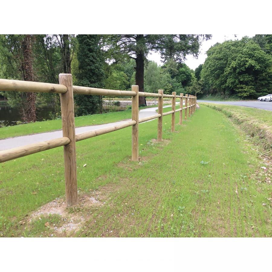 Barrière de clôture en pin traité classe IV avec poteau Ø 140 mm avec chamfrein et perçage 2 trous pour 2 lisses Ø 80 mm.